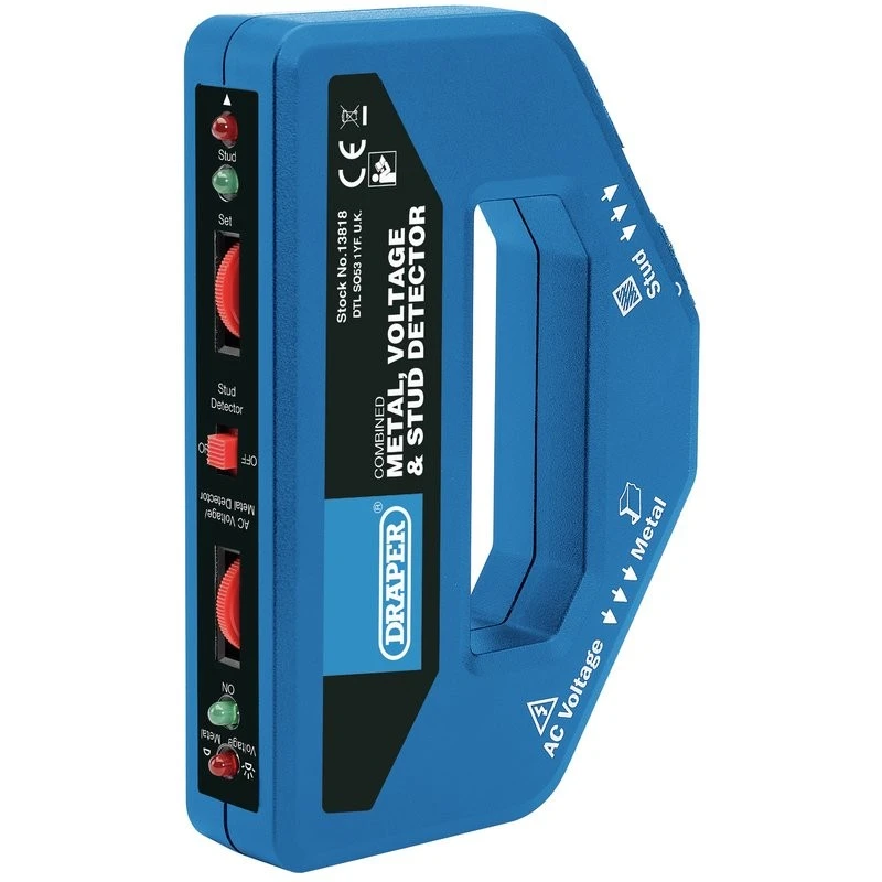 The Draper Combined Metal, Voltage and Stud detector can detect live or dead electricity cables, metallic water pipes, nails and other metal objects and wood studs in partition walling which can be located without causing surface damage. Its maximum depth penetration is 27mm and uses a PP3 size battery which is sold separately. A detailed instruction leaflet is enclosed with each tool.