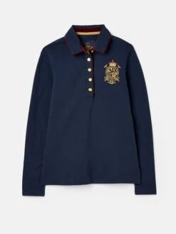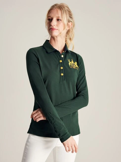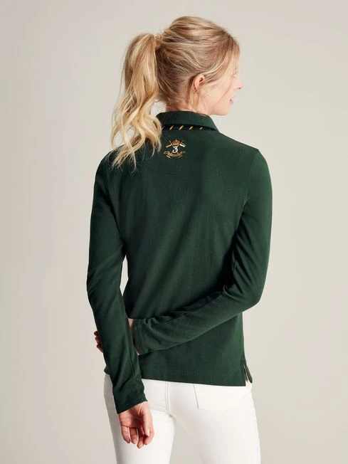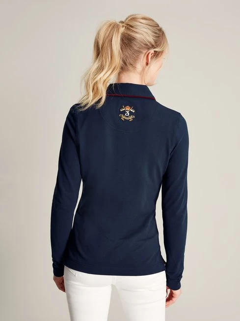 Combining a traditional polo style with a feminine shape, the Ashley is a must for your wardrobe. It has a slim fit that hugs the body and is made from soft cotton pique with added stretch. Elevating it beyond a ‘basic’ polo is the plush velvet undercollar and trim as well as the gold metal buttons. An intricate Joules polo club badge has been embroidered to the chest along with embroidered polo mallets and the player number 3 embroidery to the outer back neck.