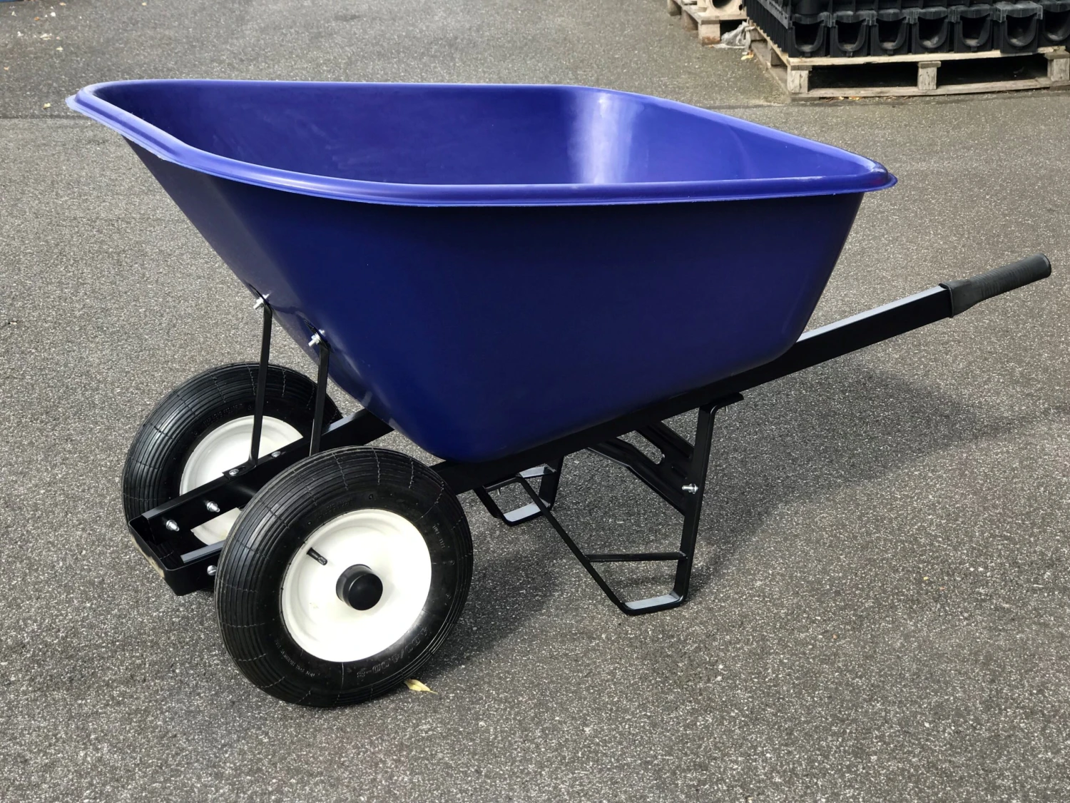 This large blue two-wheeled (4 x 8″) plastic wheelbarrow is made with a steel frame and plastic body and is capable of holding up to 200L. It is ideal for use at equestrian stables and yards, in and about the garden or on a building site. The wheelbarrow is sturdy thanks to its 2 large wheels and is easy to steer and lift. This wheelbarrow is extremely durable and can live up to the many tasks which you may throw at it. The plastic tub is supported by the handles, which run all the way along the barrow for extra strength and extra control when you are moving it about both empty and full. Its 200L capacity makes it perfect for carrying any bedding, straw, feed, large garden materials, building supplies or water bags.