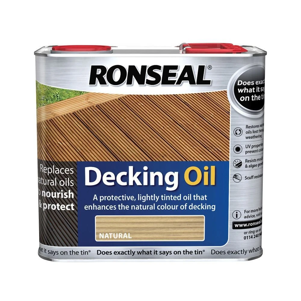 Ronseal Decking Oil Natural 2.5L both nourishes and protects your decking, leaving a lightly tinted, natural looking finish. It provides a protective barrier against water penetration where constant weathering can cause swelling and warping. It is rainproof in 2 hours, and can be given another coat in just 6 hours. Simply apply this product using a brush to your decking. Covers up to 8m per litre on average.