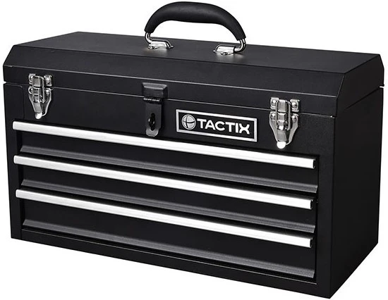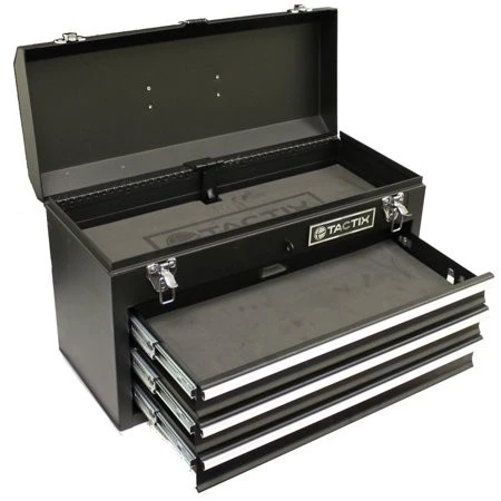 This is a fantastic all steel construction 3 drawer toolbox with an integrated top storage compartment. Each of the 3 drawers is 520mm long and are locked in place when the lid is closed, only able to be opened when the lid is opened again. This means the drawers will stay closed during transportation and will be permanently closed if you lock the lid using the supplied catch. 2 draw bolt latches also help keep the lid closed. The toolbox features a soft grip handle for easy transportation. The drawers are full-extension and run on ball bearings for a smooth open and close and feature aluminium drawer pulls. 52 W x 23 D x 31 H cm