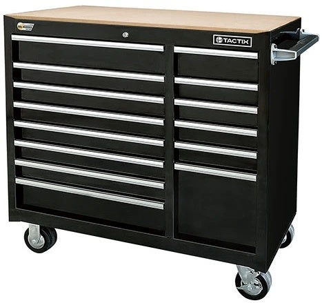 The Tactix 326004 Tool Cabinet is a 14 drawer tool chest that boasts a flush mounted push bar for easy cabinet movement and fantastic heavy duty 13x5cm caster wheels that provide up to 1000 lbs load rating. The 14 drawers are heavy duty and fully extend out along ball bearings for smooth operation and to make placing and taking tools from the cabinet a breeze. The lining in the drawers is a grease resistant EVA material which helps keep your tools in place and reduce sliding around when you’re either moving the trolley or opening and closing the drawers. This tool chest is a good size measuring 102cm W x 46cm D x 102cm H.