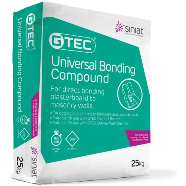 The GTEC Universal Bonding Compound 25KG is a gypsum-based material specifically designed for two primary applications: directly bonding plasterboard products to walls and attaching GTEC metal furring wall channels to your wall surfaces. As an integral component of the GTEC direct bond lining system, it simplifies the process of single-layer drylining on masonry substrates.