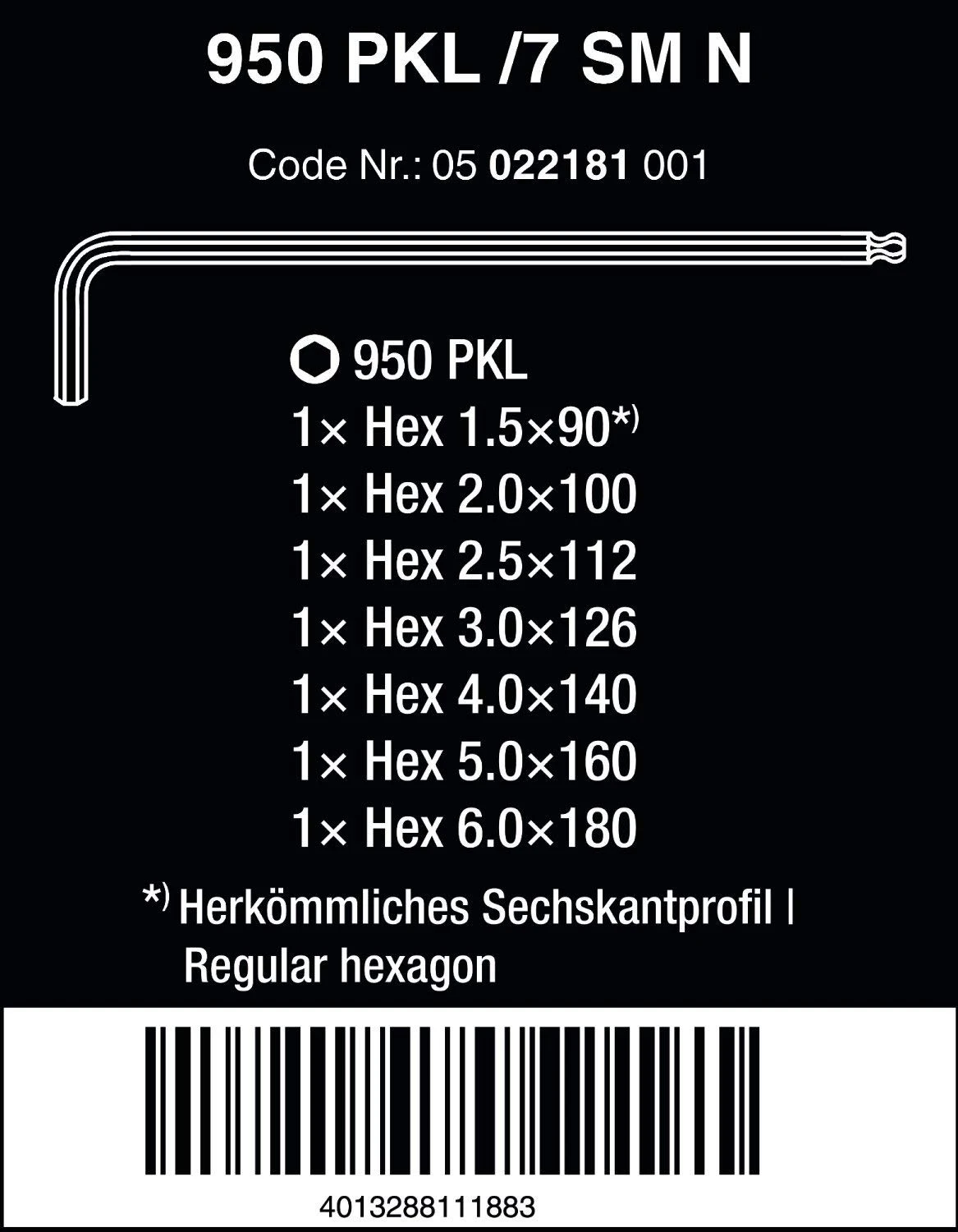The Wera 3950/9 key set is a high-quality L-key set out of stainless steel for hexagonal socket screws by Wera. Stainless steel prevents the formation of extraneous rust. The Hex-Plus profile offers a larger contact surface within the screw head. This reduces the notching effects to a minimum and almost completely eliminates the risk of destroying the screw recess. Hexagonal ballpoint end on the long arm: the ballpoint drive profile means that it is possible to swivel the tool axis away from the screwdriving axis, thus enabling round the corner” screwdriving. Comes in a practical clip fastener out of wear-resistant material, enabling secure storage of the L-keys as well as simple removal.