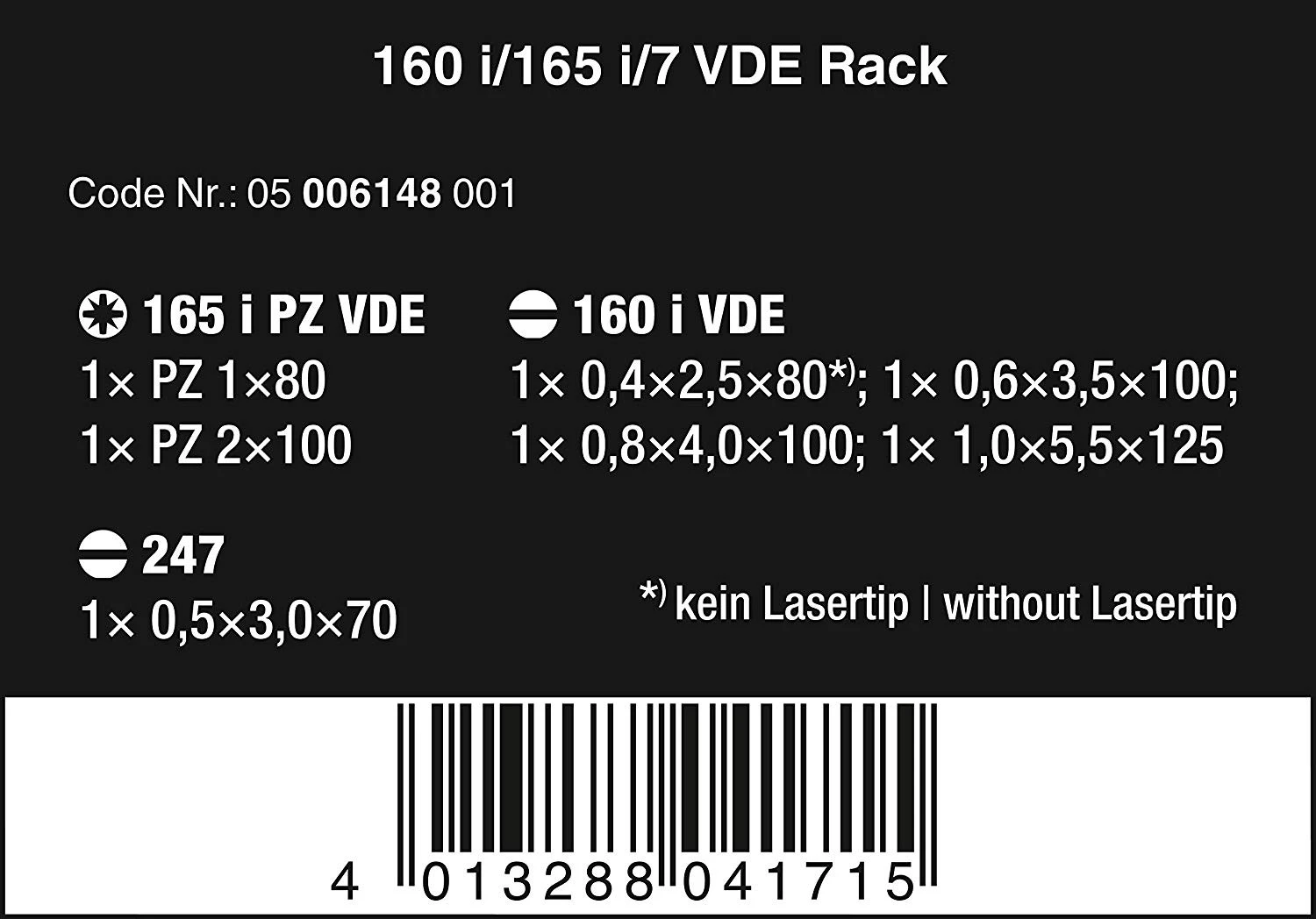 7 piece screwdriver set with individually tested, insulated screwdrivers as per IEC 60900. Individual testing in a water bath at 10,000 volts so as to ensure safe working at the permitted voltage of 1,000 volts. Kraftform Plus handle for pleasant, ergonomic working that makes blisters and calluses a thing of the past. Hard gripping zones for high working speeds whereas soft zones ensure high torque transfer. Partially Lasertip: the tip literally bites itself into the screw head and prevents any slipping. Take it easy tool finder: colour coding according to profile and size. The anti-roll feature prevents any bothersome rolling away at the workplace. Including voltage tester and 1 rack for storage.